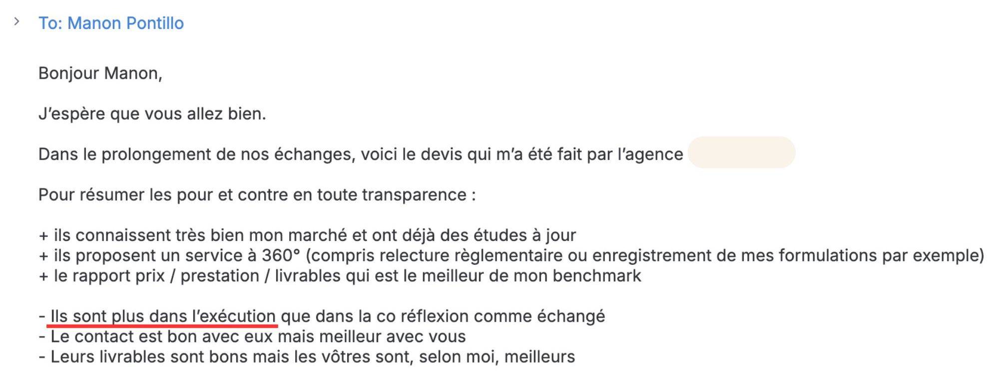 Le prix est devenu secondaire, car j'ai apporté une solution claire à sa plus grande peur. Et même le fait que mes concurrents soient plus spécialisés ou moins chers n'a pas convaincu le client.